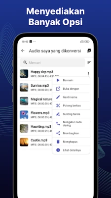 Manajemen file audio hasil konversi menjadi sangat mudah. Anda dapat dengan cepat mencari, mengganti nama, melihat detail, membagikan, atau menghapus file yang tidak lagi dibutuhkan. Pangkas audio Anda untuk mendapatkan bagian terbaiknya atau langsung gunakan sebagai nada dering pribadi yang unik. Bagikan musik yang baru Anda ciptakan dengan teman-teman Anda, sebarkan melodi favorit Anda ke mana saja. **Aplikasi pengonversi video ke MP3** ini menjamin proses yang cepat, mudah, dan selalu menghasilkan kualitas audio yang superior.