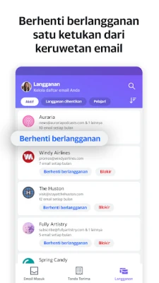 Terjebak dalam lautan email yang tak ada habisnya? Kini saatnya mengambil kendali penuh atas kotak masuk Anda. Yahoo Mail hadir sebagai asisten pribadi yang menyederhanakan cara Anda berinteraksi dengan email. Ucapkan selamat tinggal pada promosi yang membanjiri dan buletin yang tak lagi relevan. Dengan sekali ketuk, Anda dapat dengan mudah berhenti berlangganan dari daftar pengiriman yang mengganggu, tanpa perlu lagi mencari tautan kecil yang tersembunyi. Rasakan pengalaman kotak masuk yang teratur dan tenang.